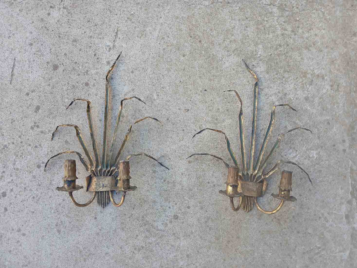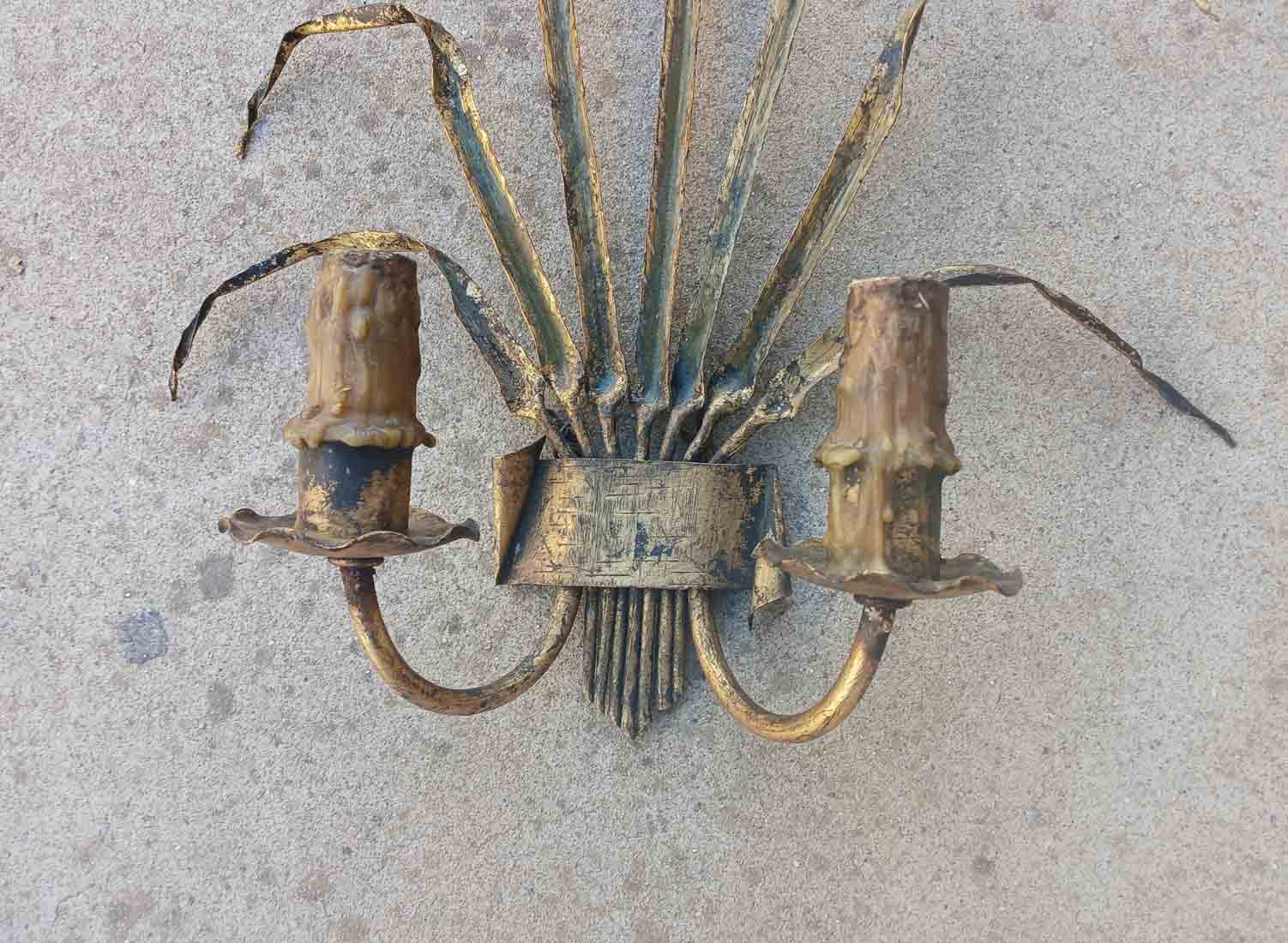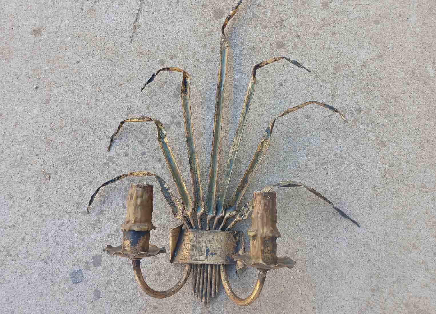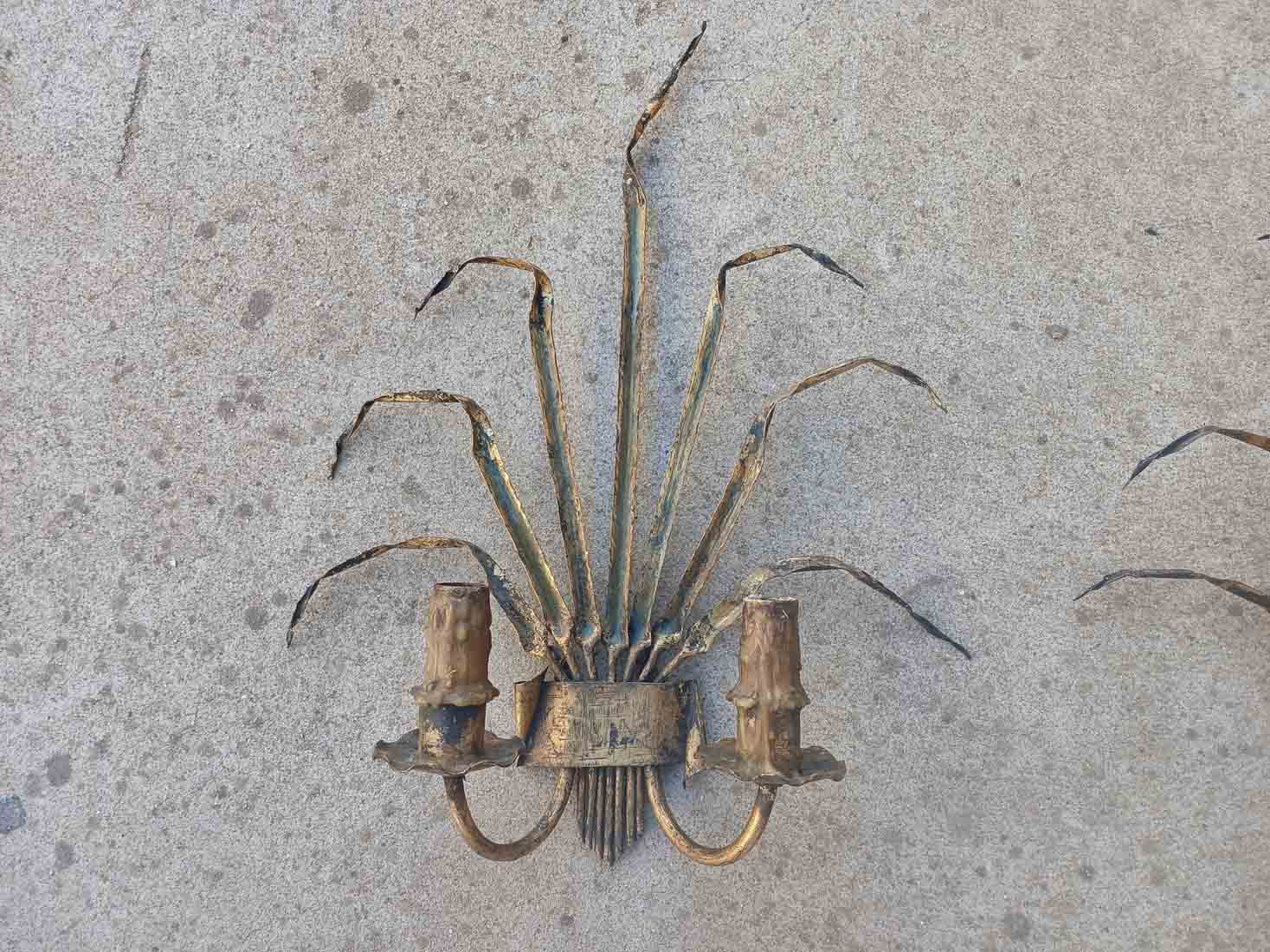 2 Dos Apliques antiguos de diseño hierro forjado dorado (años 60). Lámpara Aplique antiguo vintage.