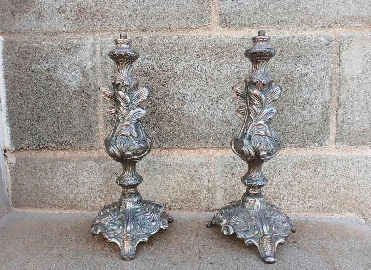 2 Dos Lámparas candelabros antiguas plata bronce plateado. Lámpara mesa sobremesa estilo Luis XV.