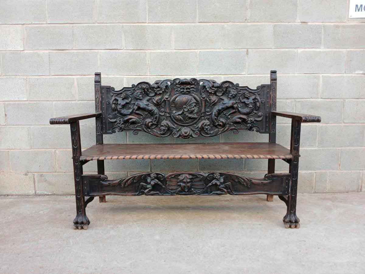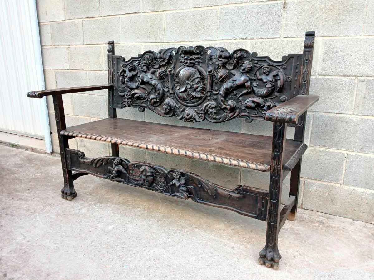 Banco antiguo tallado estilo Renacimiento. Mueble Banco Sofá antiguo madera tallada.