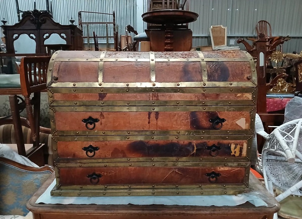 El baúl presenta señales de uso y antigüedad generalizados, cabe destacar los desgarros en el forro exterior; en el lateral izquierdo y en la parte derecha de los cajones.