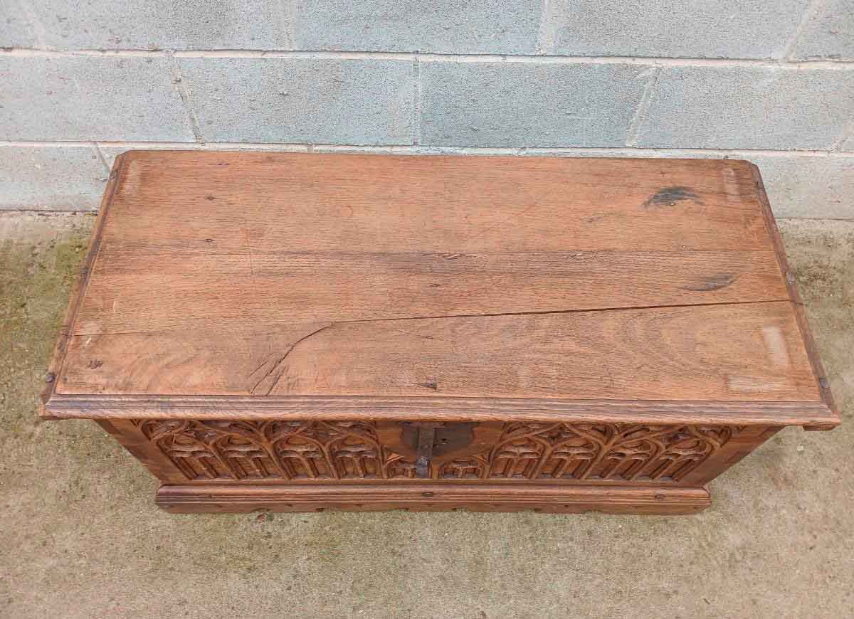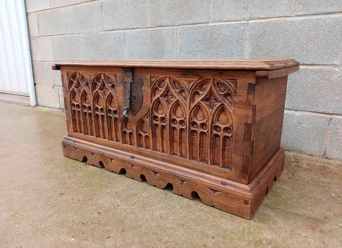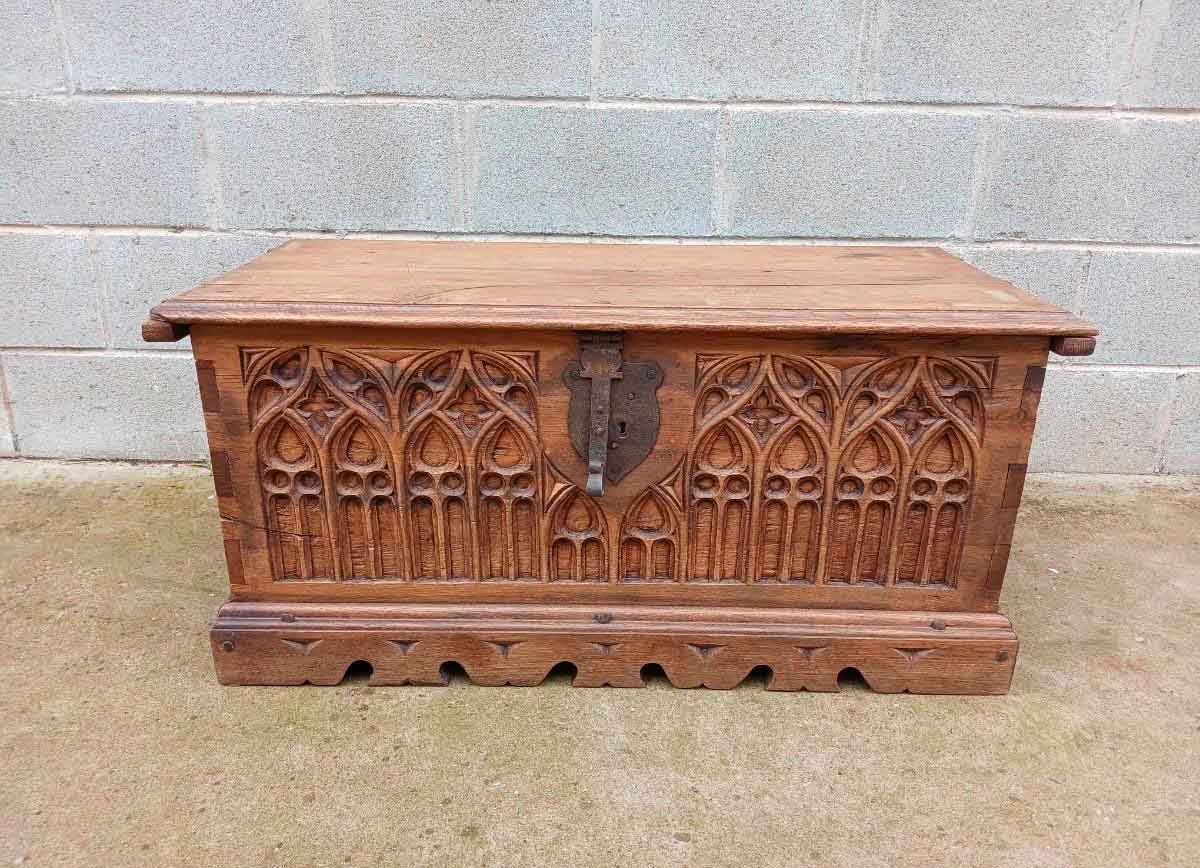 Baúl antiguo estilo Gótico. Baúl antiguo estilo Neogótico. Arcón Cofre Arca antigua madera tallada.