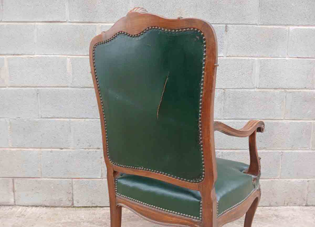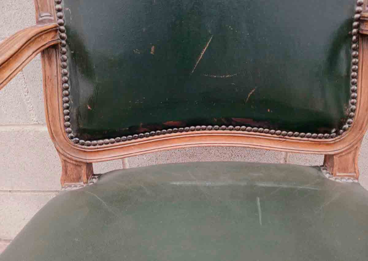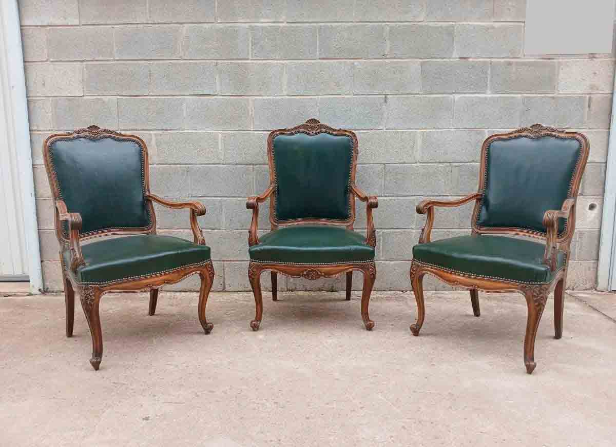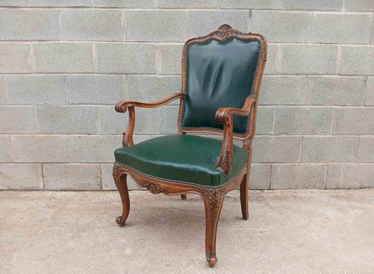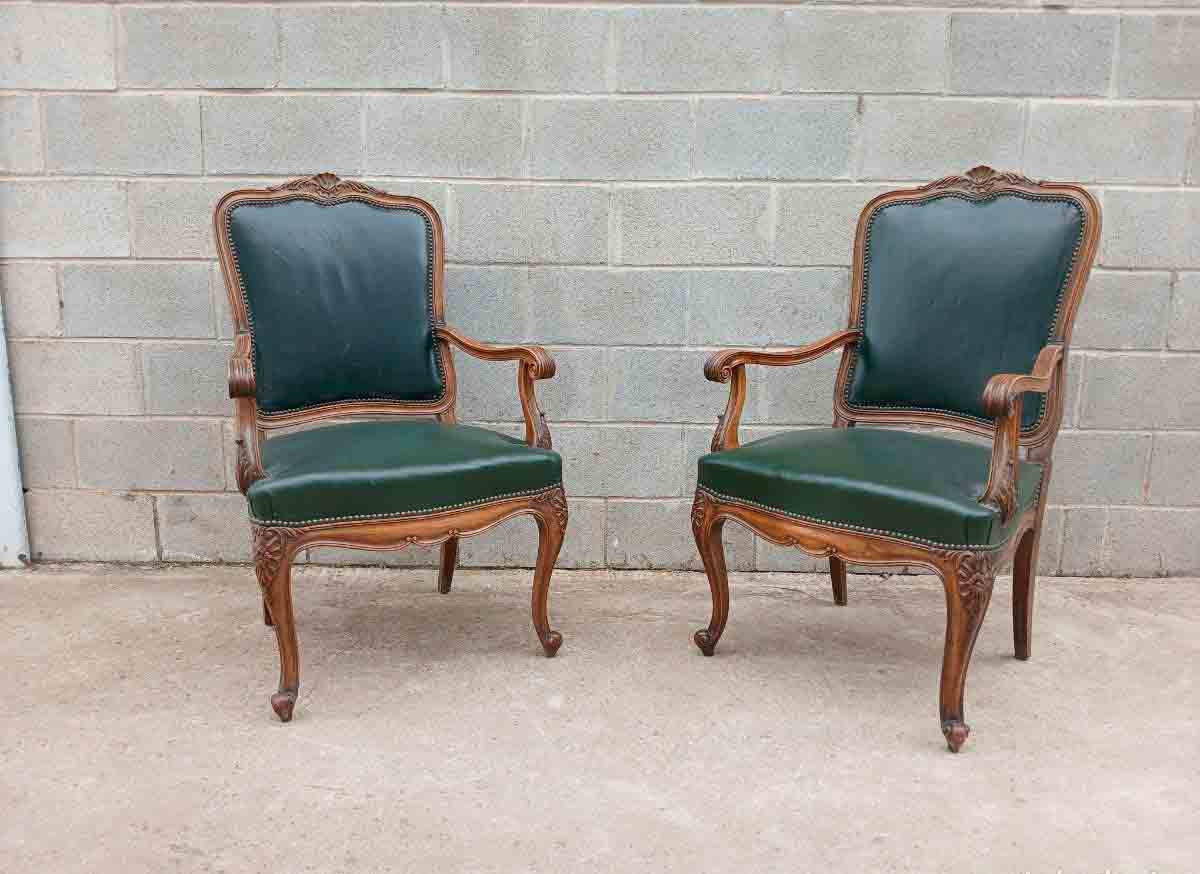 Conjunto Sillones antiguos estilo Luis XV despacho cuero verde. Pareja Sillón antiguo Silla antigua.