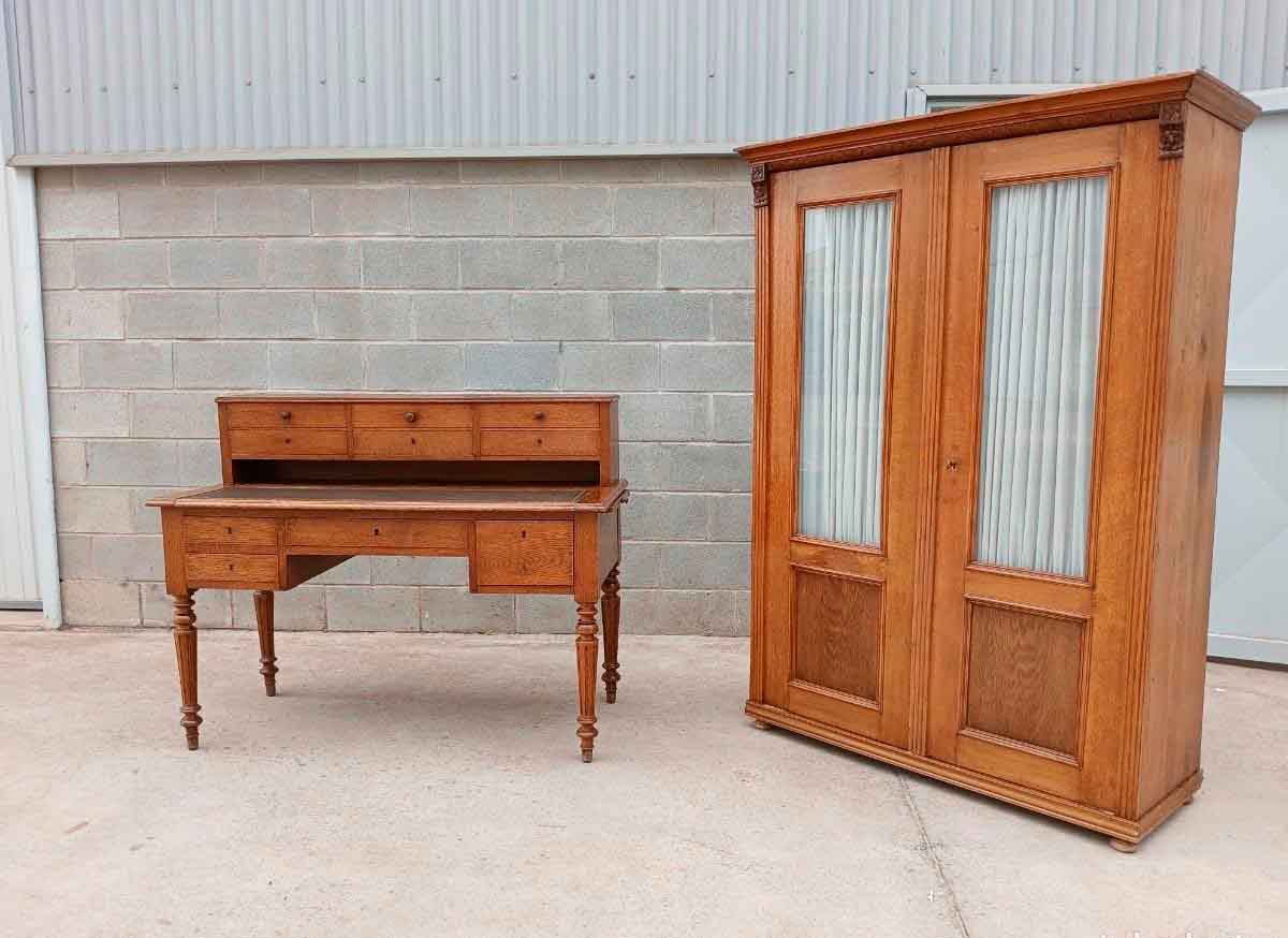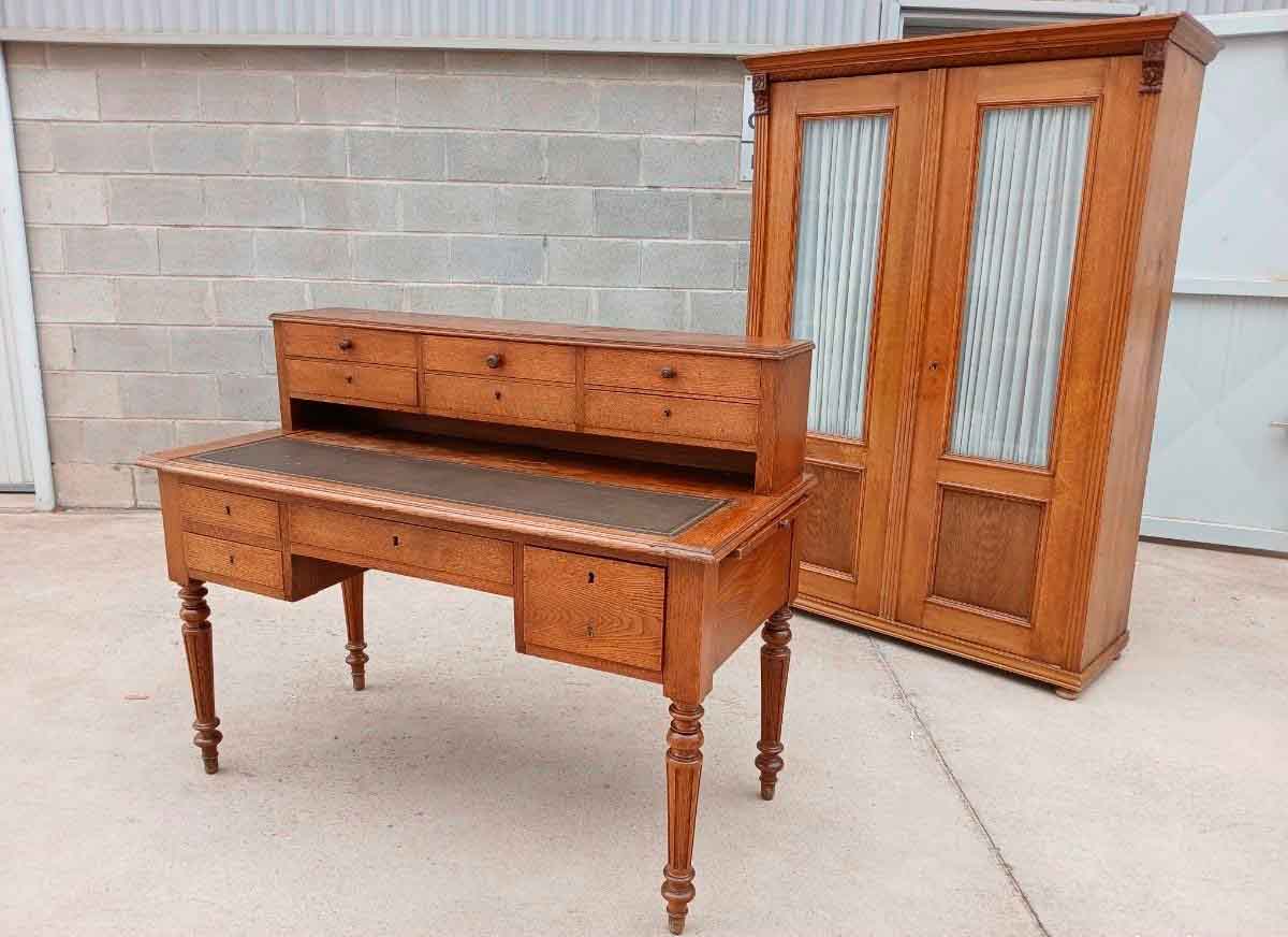 Escritorio antiguo Mesa Despacho antigua cuero verde estilo Luis Felipe + Mueble Librero.