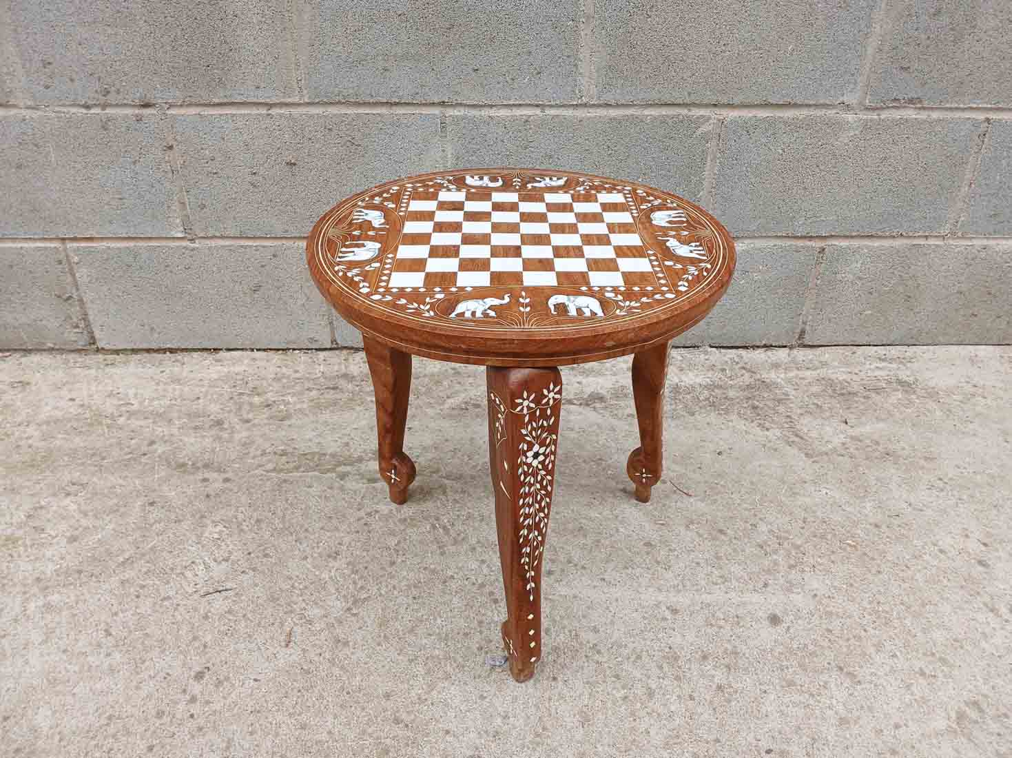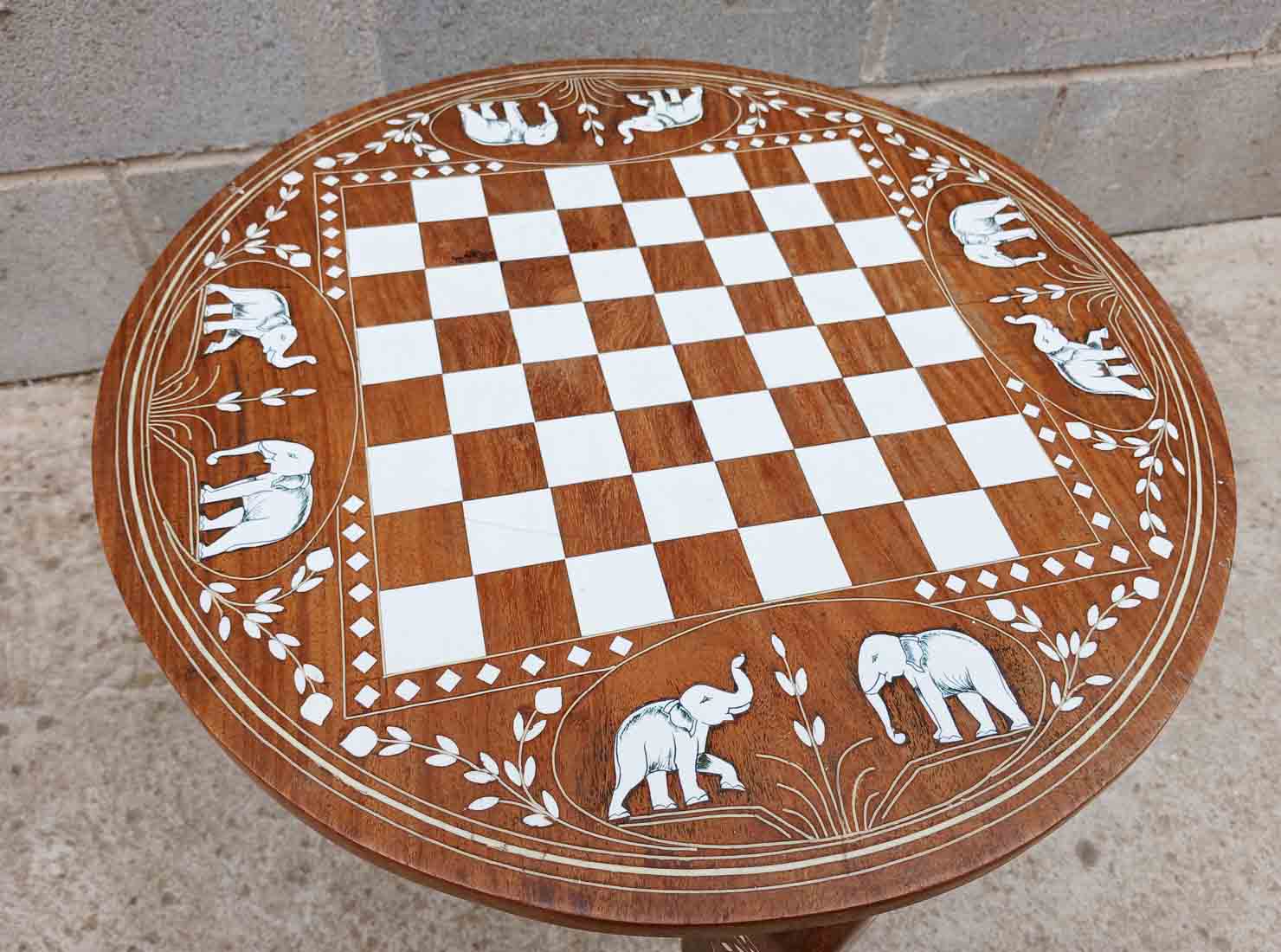 Mesa de ajedrez marquetería artesanal con incrustaciones.