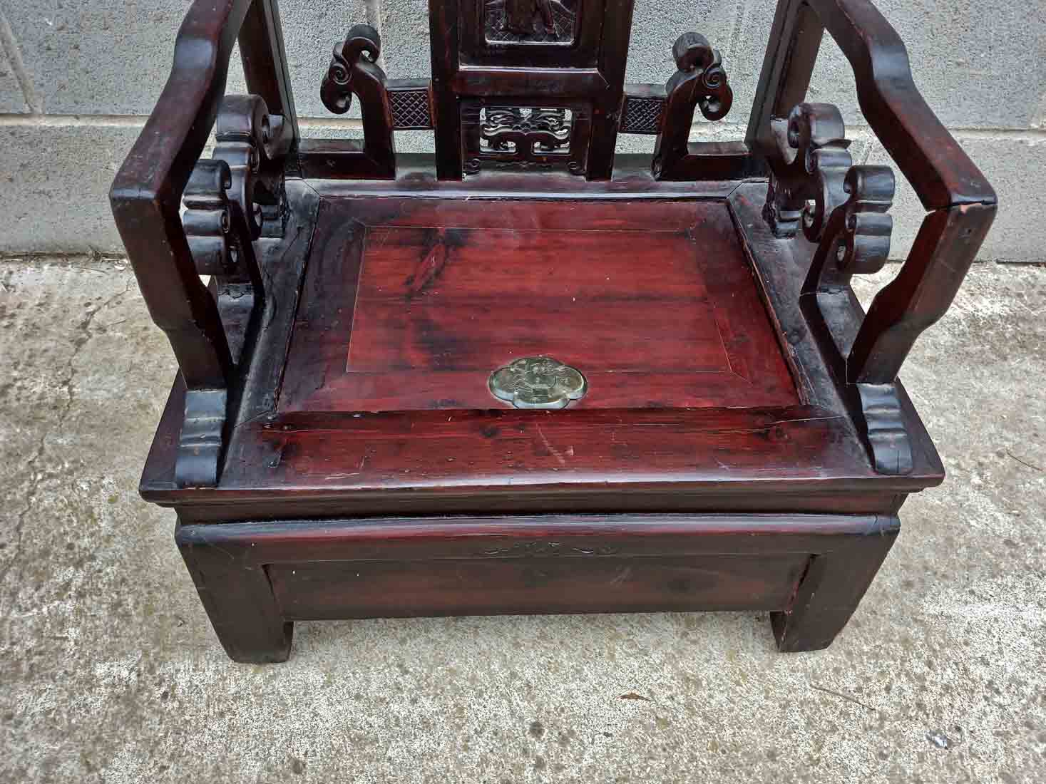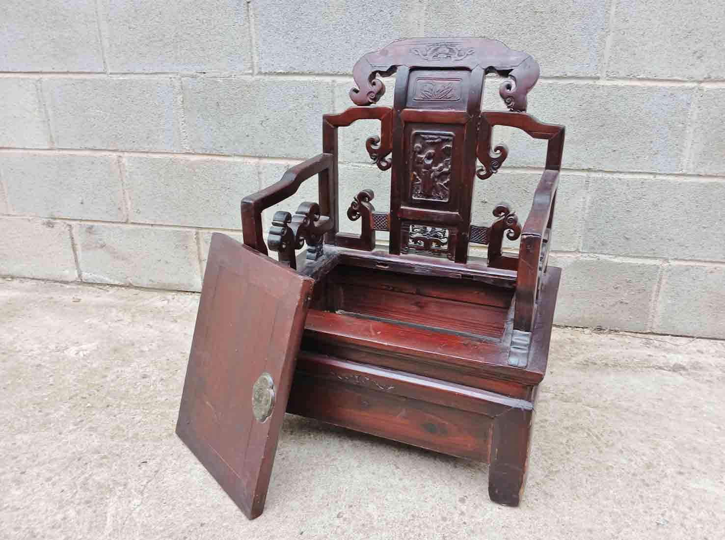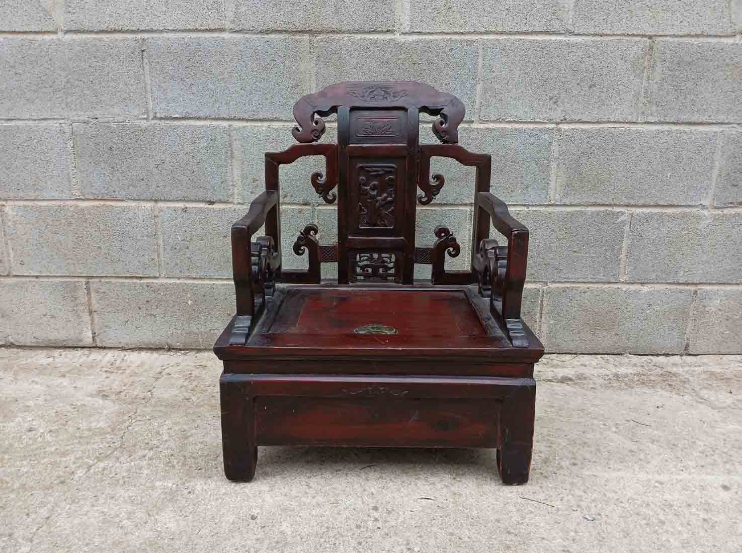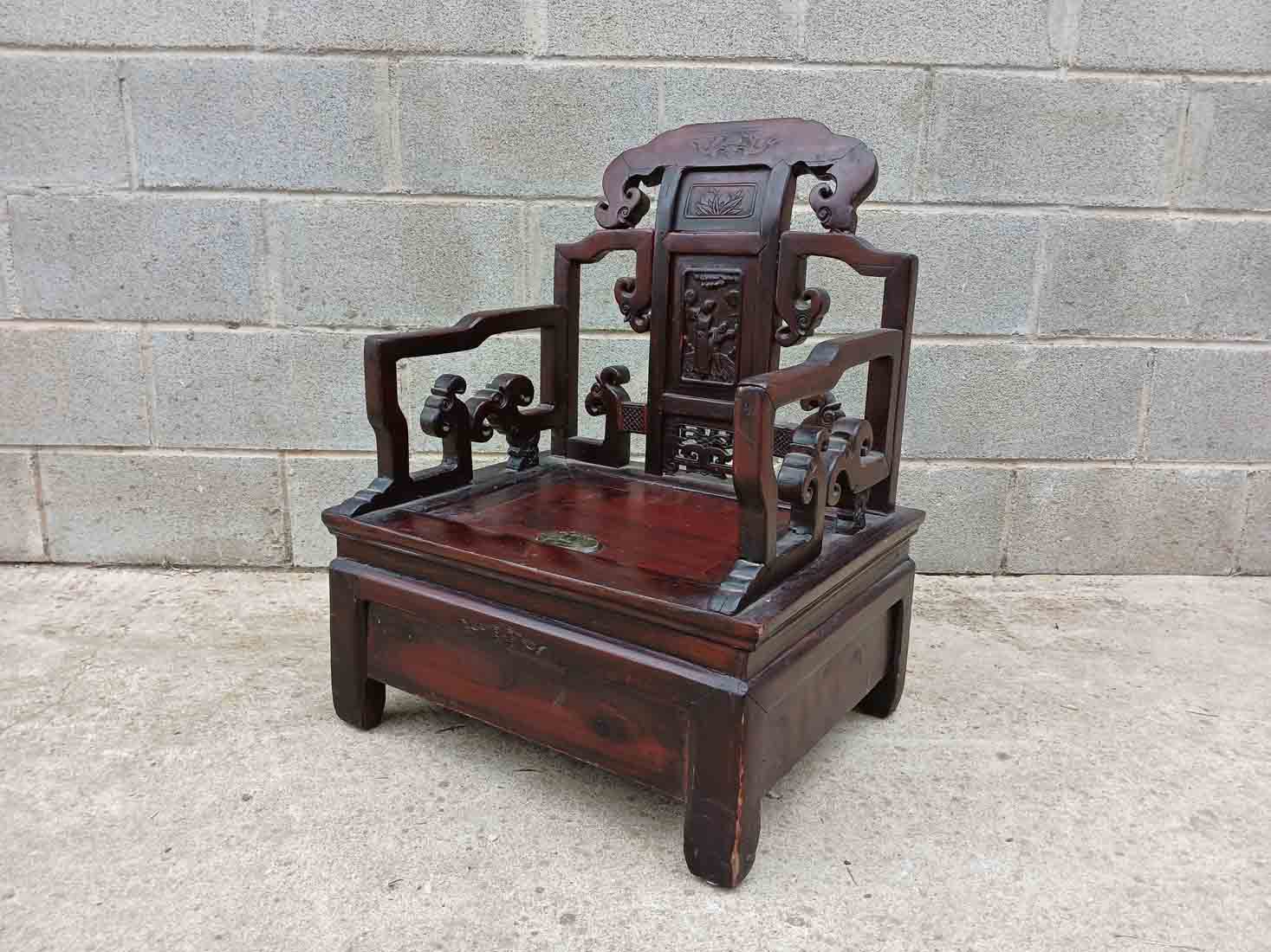Pequeña Silla antigua estilo Chino. Mueble Silla antigua baja China con compartimento.